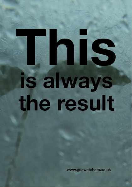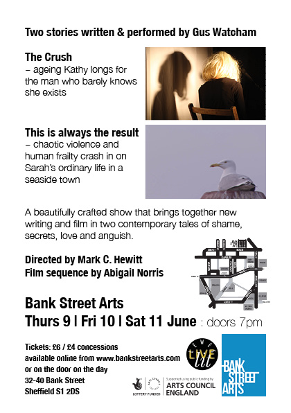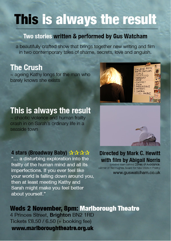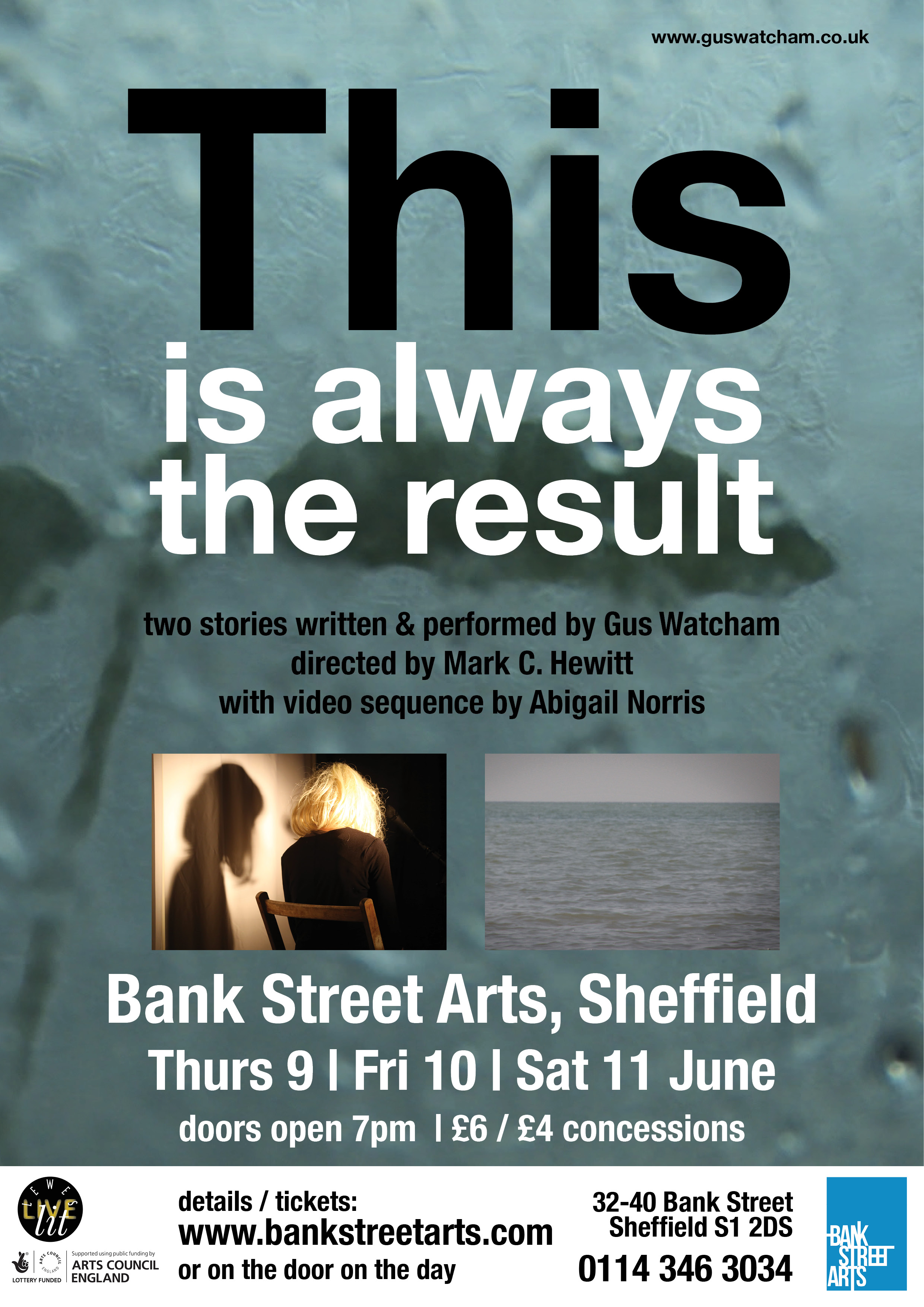 Told in the voice of a mother, 'This is always the result' relates the story of a young man's attempted suicide as well as weaving in other strands to do with everyday life, what one happens across on the internet and seagulls. The work is a wonderful medium for discussion of mental health issues related to male suicide. Gus is a supporter of CALM (Campaign Against Living Miserably).