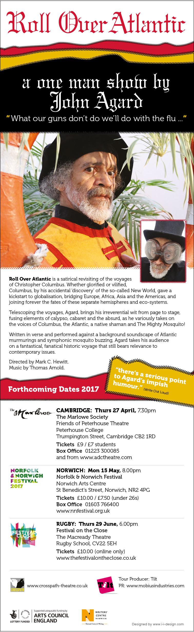Roll Over Atlantic is a satirical revisiting of the voyages of Christopher Columbus. Whether glorified or vilified, Columbus, by his accidental ‘discovery’ of the so-called New World, gave a kickstart to globalisation, bridging Europe, Africa, Asia and the Americas, and joining forever the fates of these separate hemispheres and eco-systems. Telescoping the voyages, Agard, brings his irreverential wit from page to stage, fusing elements of calypso, cabaret and the absurd, as he variously takes on the voices of Columbus, the Atlantic, a native shaman and The Mighty Mosquito. Written in verse and performed against a background soundscape of Atlantic murmurings and symphonic mosquito buzzing, Agard takes his audience on a fantastical, fanatical historic voyage that still bears relevance to contemporary issues.