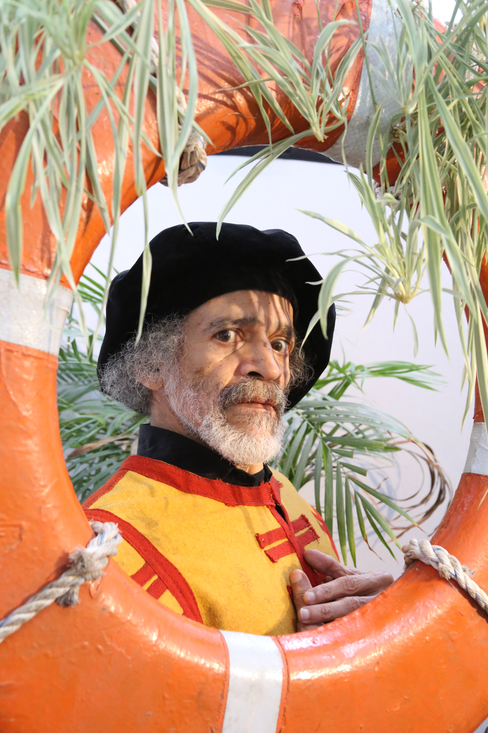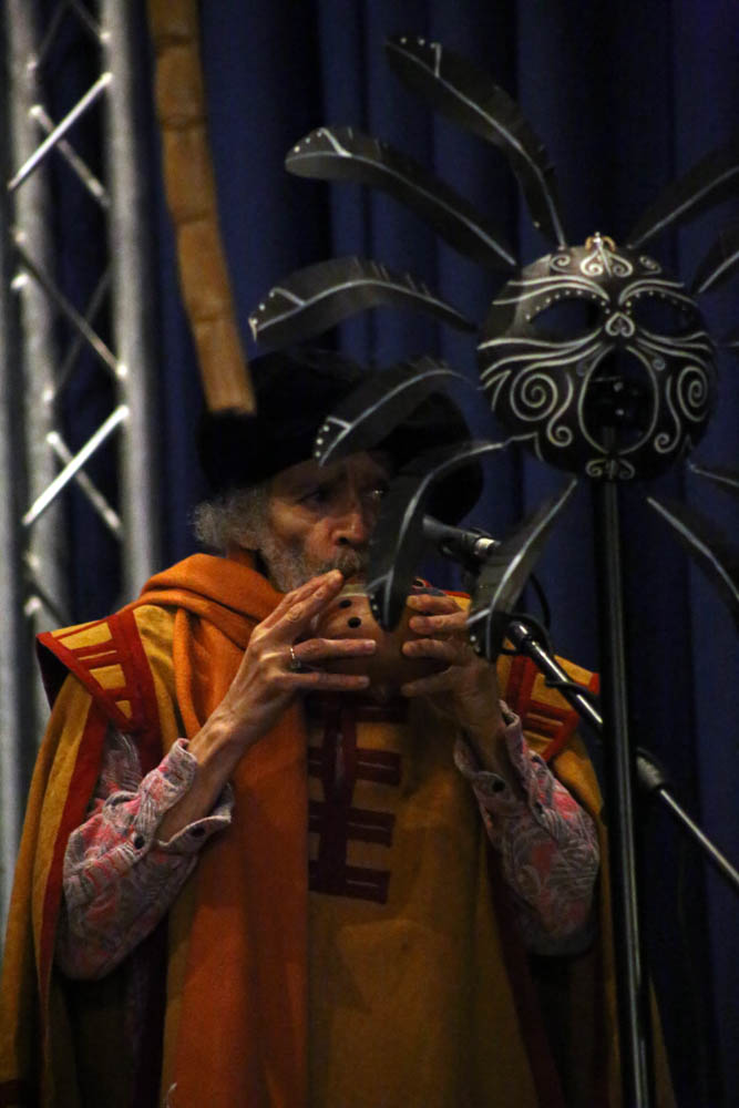 Following a wonderfully funny and whilst not entirely flattering, at least honest introduction, Christopher Columbus (John Agard) comes onto the stage dressed in a curious mixture of modern day and fifteenth-century clothing. As Columbus tells his story, John takes on the role of Columbus himself and tells his story. The first point concerns Columbus’ origin and despite many countries and historical fantasists claims, the chap was a Genoese weaver’s son. Blending a mixture of historic fact and satire, and utilising the medium of poetry, song and the disembodied voice of the Atlantic ocean, John takes the audience with Columbus on his voyage to find a new route to the Orient. Over the period of around ninety minutes, we discover that the journey was long and hard,with talk of mutiny growing more vociferous as time went on. Ultimately, Columbus’ voyage would probably have been successful if the American continent hadn’t got in the way. As Columbus explores the area he has stumbled upon, there is a truly magical scene where John is behind a mask with a single blue light on him, naming each island Columbus visits.