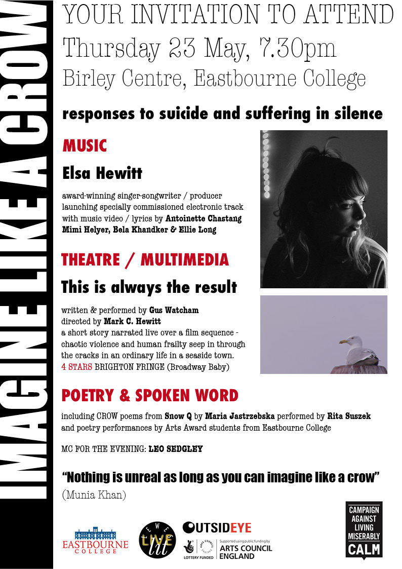 Special event raising awareness of the problem of suicide and suffering in silence, especially amongst young people. The evening featured a range of artistic responses. Multimedia theatre: This is always the result by Gus Watcham; the launch of a specially commissioned track by award-winning songwriter Elsa Hewitt (pictured) with accompanying music video by Arts Award students from Eastbourne College; and spoken word, including 'Crow' poems from Snow Q by Maria Jastrzebska performed by Rita Suszek. MC was Leo Sedgley. An event supporting CALM - the campaign against living miserably. Part of LLL's Outside Eye season.