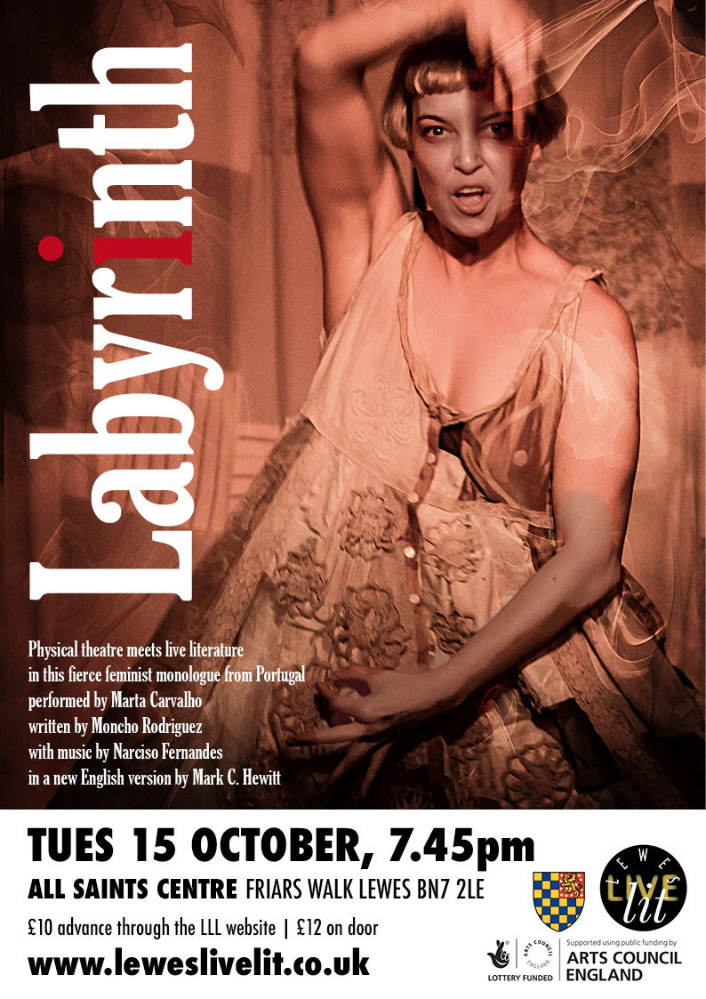 Physical theatre met live literature in this compelling monologue from Portugal which hovered ambiguously between murder and vivid fantasy. This was the first full preview of a new English version of the text by LLL's Mark C. Hewitt, devised and performed by Portuguese actress Marta Carvalho. The original Portuguese text (‘Labirinto de Amor e Morte’) was written by Galician theatremaker Moncho Rodriguez and toured extensively by Marta Carvalho in Portugal, Brazil and parts of Spain. Music was composed by Narciso Fernandes, featuring the voice of Clarisse Fernandes.