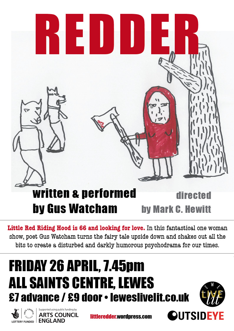 A new live literature production written and performed by poet Gus Watcham. Little Red Riding Hood is 66 and looking for love! In this fantastical one woman show, Gus turns the fairy tale upside down and shakes out all the bits to create a disturbed and darkly humorous psychodrama for our times. Directed by LLL's Mark C. Hewitt as part of the Outside Eye season.
