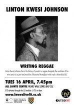Writing Reggae. Poet Linton Kwesi Johnson gave his own unique take on the history and poetics of reggae culture, taking in its oral storytelling traditions and use of the Bible as well as the development of black consciousness and dub lyricism; and how his connection witn reggae influenced the evolution his own career as a poet and musician. Part of LLL's Outside Eye season.