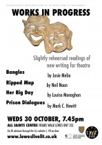 Third in a series of LLL midweek rehearsed readings showcasing new writing for theatre by local playwrights. Works performed included: Her Big Day by Louise Monaghan, Ripped Map by Neil Noon, Bangles by Josie Melia, and Prison Dialogues by Mark C. Hewitt. Actors were Leann O'Kasi, Araba Jane, Sarah J. Lewis, Sharon Lloyd, Martina Moss-Clarke and Samson Steer-Khan.