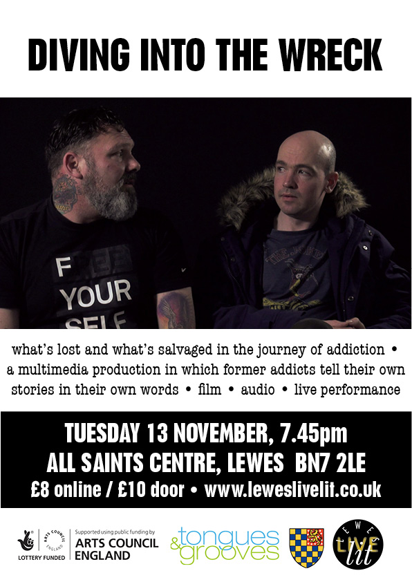 First performance in East Sussex of Diving into the Wreck, a multi-media production in which individuals in recovery from addiction tell their own story in their own words through film, audio and live performance. With live performances by Daniel Scrivener, Kieran Judge and Jane Muir with support from poet Maggie Sawkins. Musical interludes by Martin Heys and Pam Hewitt. Directed by LLL's Artistic Drector, Mark C. Hewitt. A Tongues&Grooves production. Part of LLL's Outside Eye season of events.