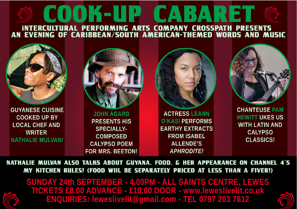Presented in association with intercultural performing arts company, Crosspath, as part of LewesOctoberFeast and featuring Guyana-born poet John Agard, actress Leann O’Kasi performing extracts from Isabel Allende’s Aphrodite, chanteuse Pam Hewitt and local chef and writer, Nathalie Mulvan.