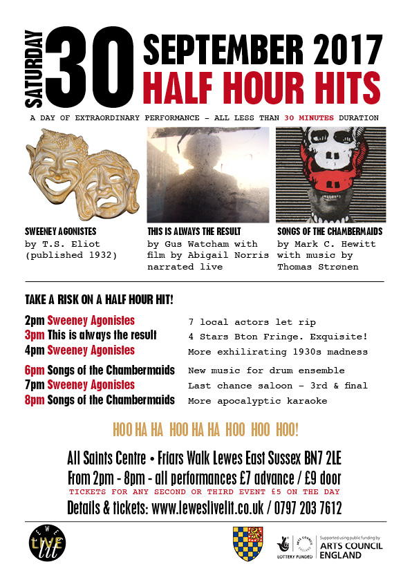 Day long R&D platform in which all performances were no longer than 30 minutes duration. The day featured three performances of T.S. Eliot's visceral dramatic fragment, Sweeney Agonistes, written in the 1920s and presented in a rehearsed reading by seven local actors, Gus Watcham's exquisite live film narration This is always the result and a first preview of Mark C. Hewitt's Songs of the Chambermaids with music for percussion ensemble by Thomas Strønen.