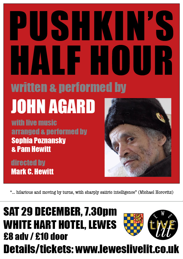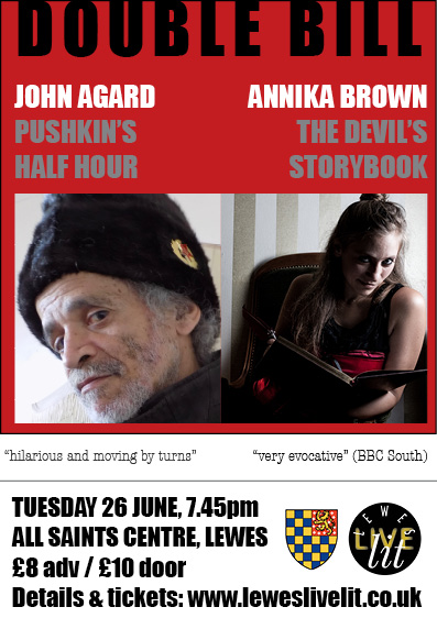 First performance of a whirlwind homage to Pushkin's famous verse novel, Eugene Onegin, by Caribbean British poet John Agard. With live incidental music by Sophia Poznansky (accordion) and Pam Hewitt (ukulele and voice). Plus extracts from The Devil's Storybook Experience by Annika Brown: original edgy songs performed on acoustic guitar and accordion interlinked with snippets of John Agard’s poetry from his collection, From the Devil's Pulpit.