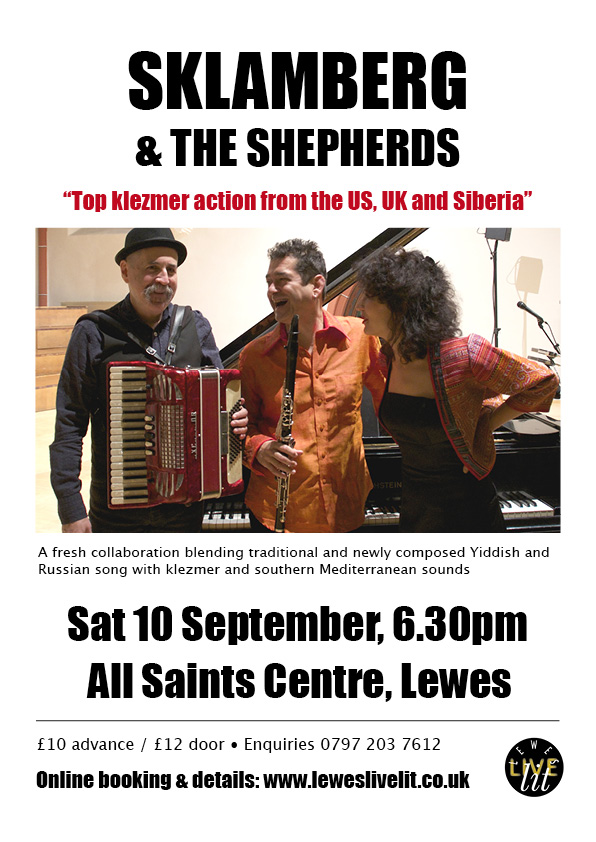 Sell out trio performance of Eastern European Jewish music by Lorin Sklamberg (American Grammy award winning lead singer of the Klezmatics) with Sussex-based clarinetist Merlin Shepherd and acclaimed vocalist / pianist Polina Shepherd, originally from Siberia.