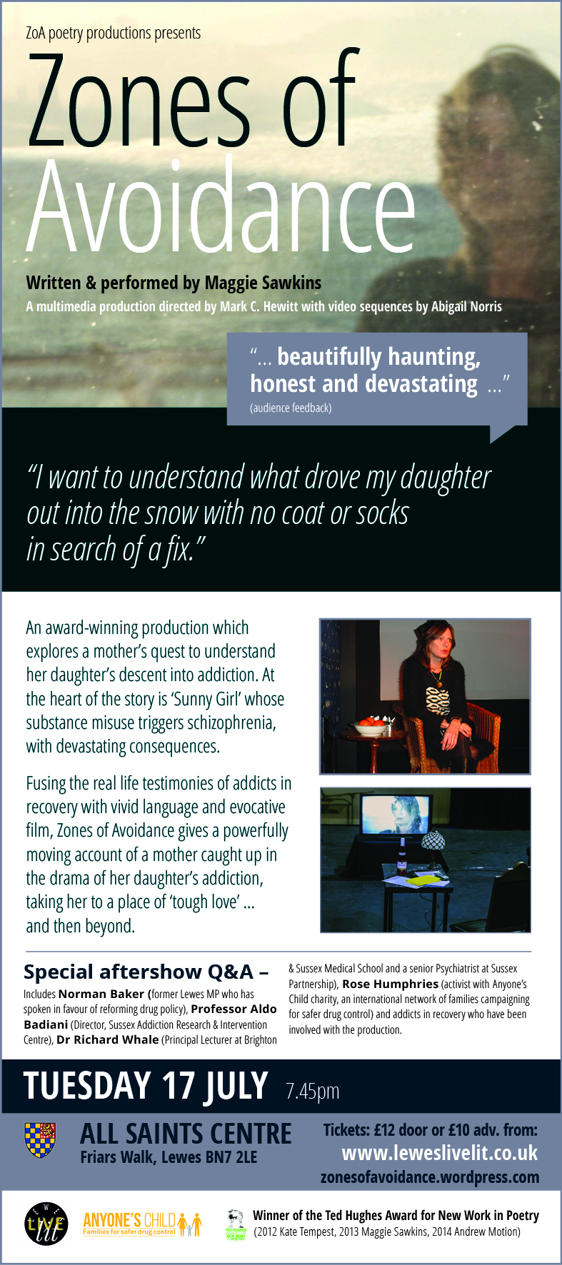 A restaging in Lewes of the award-winning multimedia production about addiction, written & performed by Maggie Sawkins and directed by LLL's Mark C. Hewitt with video sequences by Lewes artist Abigail Norris. With special aftershow Q&A panel, including former Lewes MP Norman Baker, Professor Aldo Badiani (Director, Sussex Addiction Research & Intervention Centre), Dr Richard Whale (from Brighton & Sussex Medical School who clinically leads a nationally renown Early Intervention in Psychosis service in Brighton), Rose Humphries (activist with Anyone’s Child charity, an international network of families campaigning for safer drug control) and Jane Muir (former addict who runs a Recovery Café in Portsmouth).