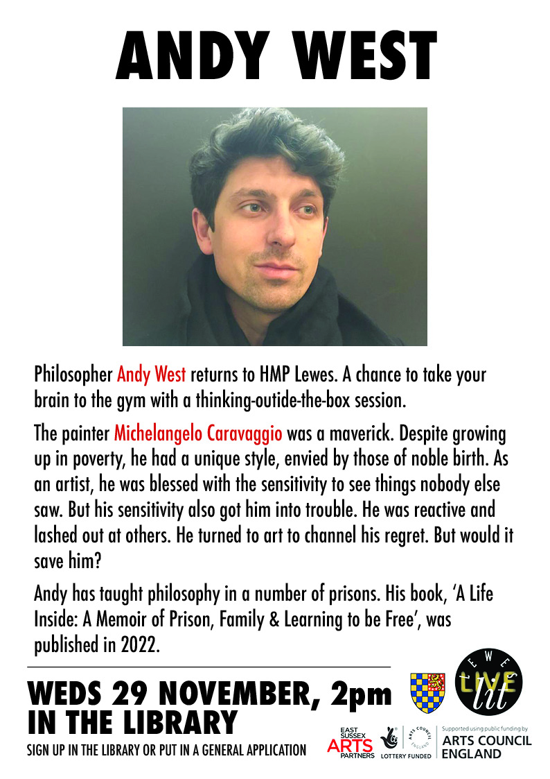 Start of a series of LLL events at Lewes Prison. Philosopher Andy West led a presentation and conversation about the famous Italian renaissance artist Caravaggio, whose violent life and prodigious talent created a series of moral dilemmas. Andy West is the author of The Life Inside: A Memoir of Prison, Family and Learning to be Free (Picador, 2022). It tells the story of him visiting his dad, brother and uncle in prison in his childhood, to him teaching philosophy in prisons today and what he learnt along the way.
