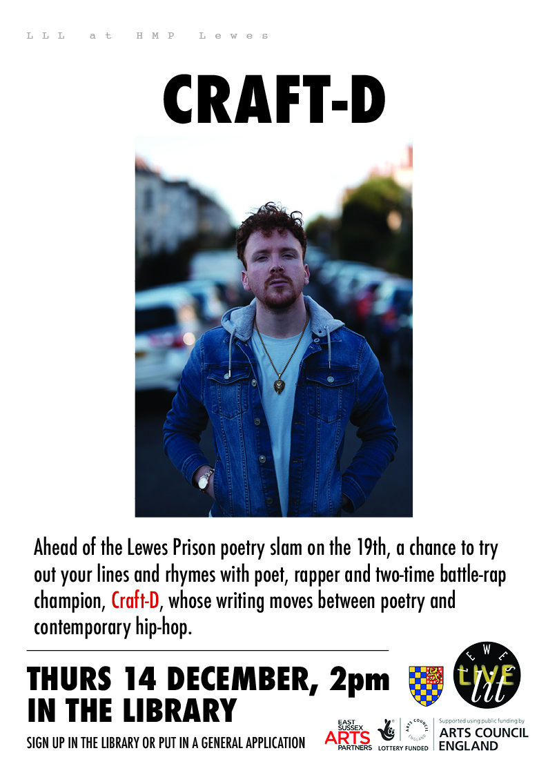 Continuing our series of events at Lewes Prison, Craft-D led a workshop with prisoners - ahead of a forthcoming poetry slam - on the art of slam poetry. Craft-D is a rap poet and two-time battle rap champion whose writing moves between poetry and contemporary hip-hop.