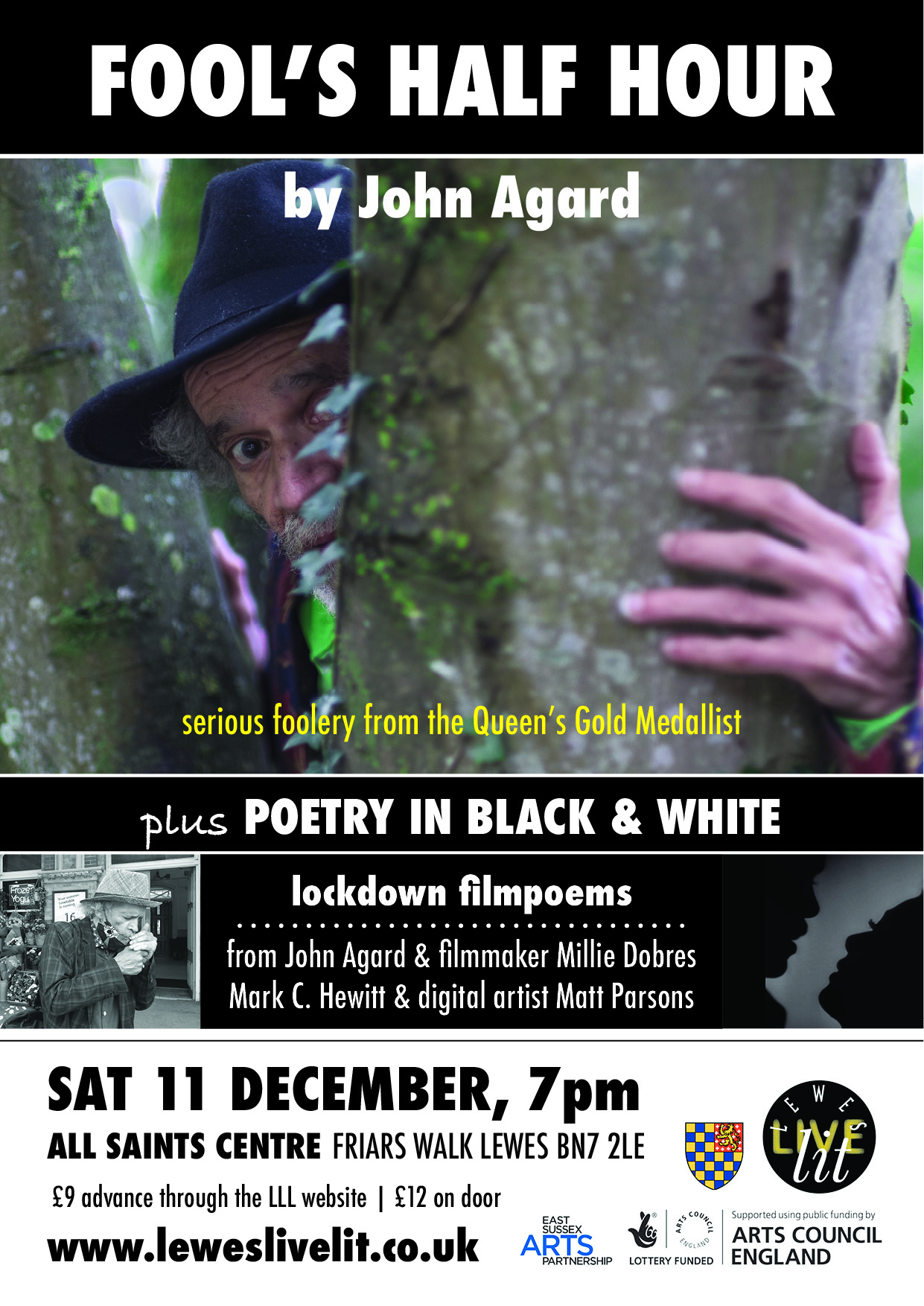 An evening of two halves. In the first, a screening of black and white lockdown filmpoems resulting from two writer/filmmaker collaborations: poet John Agard with documentary filmmaker Millie Dobres and playwright Mark C. Hewitt with digital artist Matt Parsons. In the second half, a preview of Fool's Half Hour, an entertaining 'fool-eyed lecture' / poetry performance by John Agard with projected visuals.