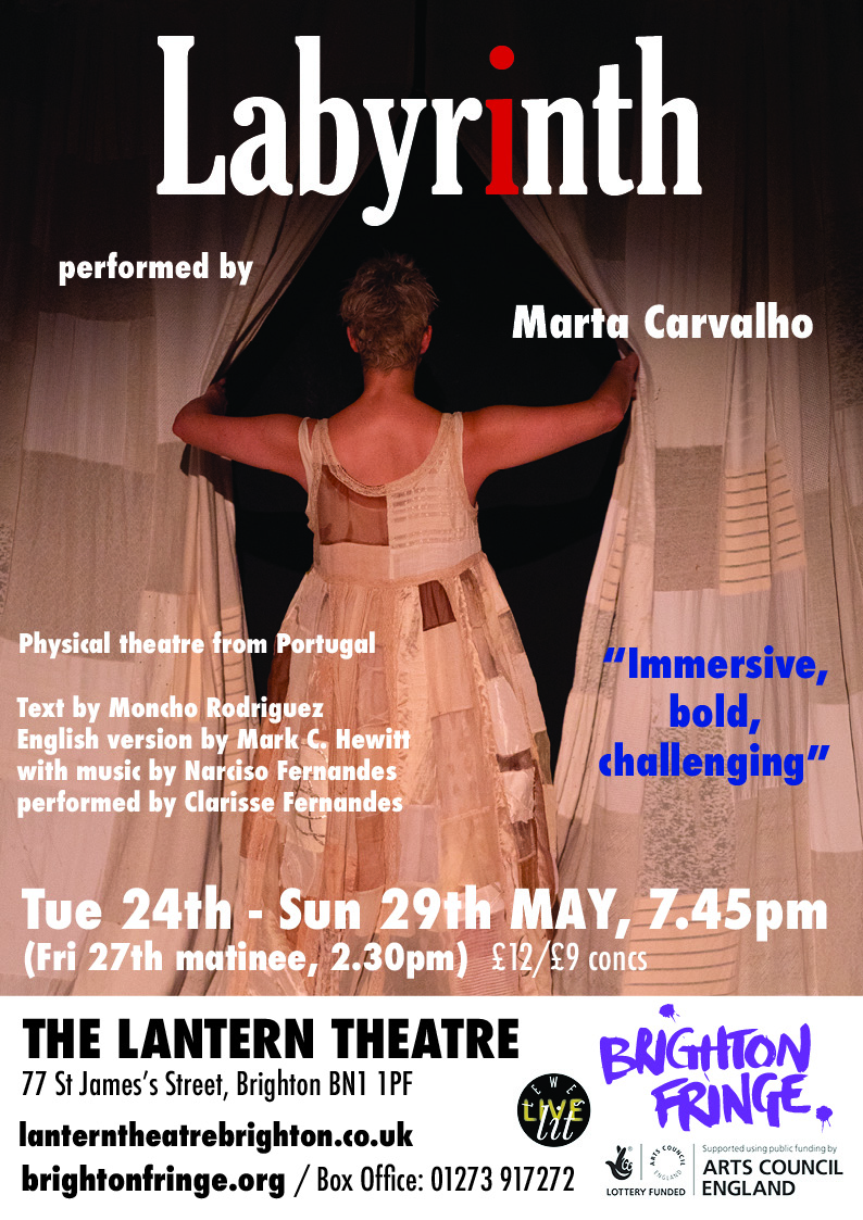 LLL Productions presented this riveting Anglo-Portuguese performance for a one week run at the Lantern Theatre in Brighton. Performed by actress Marta Carvalho, the original text (‘Labirinto de Amor e Morte’) was written in Portuguese by Galician theatremaker Moncho Rodriguez, and this was the first substantial run of dates for this new English version, co-translated by Carvalho and LLL's Artistic Director Mark C. Hewitt. "Beautifully translated, cleverly staged and so vividly performed." (Audience Feedback)