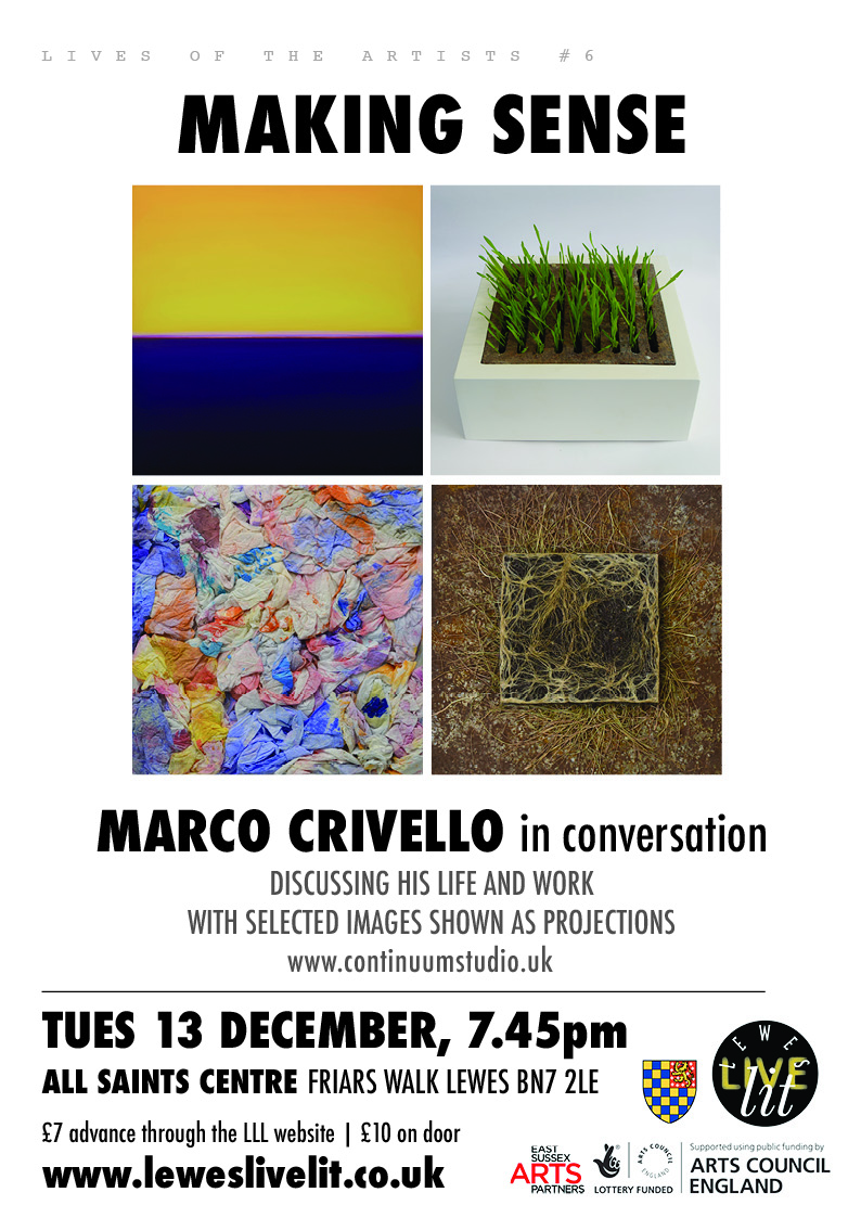 Lives of the Artists #6: MAKING SENSE. Marco Crivello in conversation with LLL's Artistic Director Mark C. Hewitt, discussed the development of his work from his early improvisations with form, colour and tonal relationships to his preoccupation with 'noticing' and the use of found objects and bricolage.The event was the latest in a series of conversational events illustrated with projected images in which local artists talk about how and why they do what they do in the way that they do it.