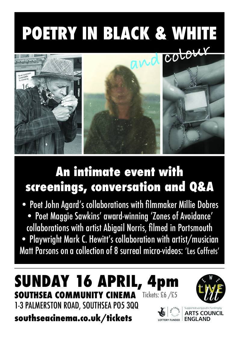 Sun 16 April, Southsea Community Cinema, Portsmouth: Maggie Sawkins presented filmpoems created with Lewes artist Abigail Norris for her award-winning production Zones of Avoidance; plus Mark C. Hewitt & Matt Parsons on their surrealistic video sequence Les Coffrets and Caribbean poet John Agard's film collaborations with young documentary filmmaker, Millie Dobres.