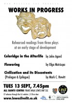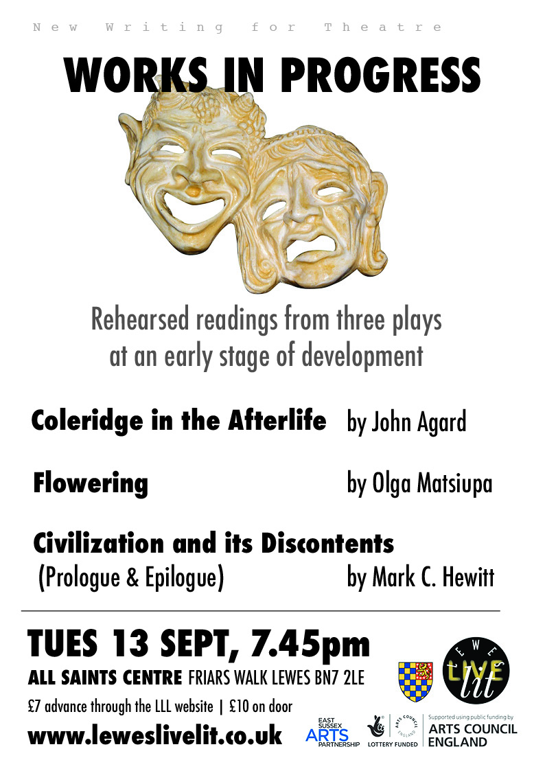 Fifth in a series of LLL midweek rehearsed readings showcasing new writing for theatre and performance. Three works were presented. Coleridge in the Afterlife by John Agard; Flowering by Olga Matsiupa; Civilization and its Discontents (Prologue and Epilogue) by Mark C. Hewitt.