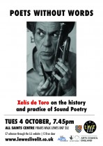 A talk/performance on the history and practice of Sound Poetry. Galician writer, performer and musician Xelís de Toro gave an overview of the artists and art movements that developed 'phonetic poetry' - from Dadaists Hugo Ball & Kurt Schwitters in the early 20th century to French Poesie Sonore to British 'Concrete Poetry'. Illustrated with archive images and short performances from the various works that were referenced.