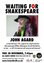 The latest one-man show by Caribbean-British wordsmith, John Agard. In Waiting for Shakespeare, John Agard took on the character of FOOL, now a famous chat show host, whose imminently expected guest is none other than The Bard himself. But would he arrive on time or would the afterlife express be delayed?