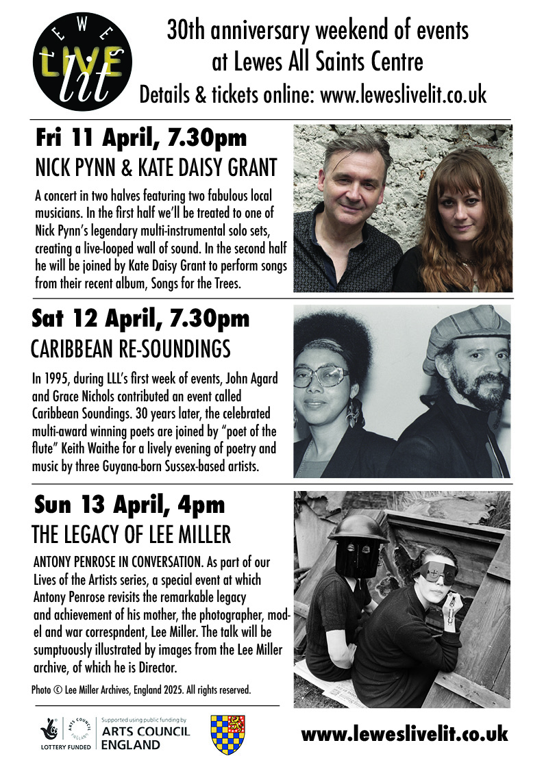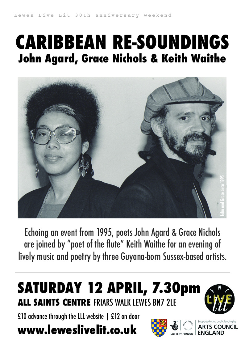 Continuing LLL's 30th anniversary weekend of events, poets John Agard and Grace Nichols were joined by "poet of the flute" Keith Waithe to present a lively evening of poetry and music from three Guyana-born Sussex-based artists. The event echoed a reading held during LLL's very first week of events in April 1995, Caribbean Soundings.