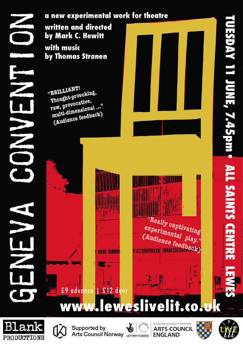 Following its premiere at Brighton Fringe Festival, the Lewes performance of an intriguing new experimental play written by LLL's Artistic Director Mark C. Hewitt. Performed by an international cast of four female performers with music by Norwegian jazz percussionist Thomas Strønen, the work takes for its structure the four parts of the Geneva Convention: Wounded & Sick / Maritime / Prisoners of War / Civilians. "Wow! Powerful - Sensitive - Touching - Moving." (Audience feedback)