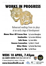 Supporting new writing for theatre. An evening of professionally performed rehearsed readings featuriing extracts from six new plays by local playwrights. Bitter Water by Rachel Mae Brady; Safe Home by Josie Melia; Mama Weer All Crazee Now by Louise Monaghan; Sandcastles by Lorraine Mullaney ; Geneva Convention by Mark C. Hewitt; Dying for Me by Neil Noon.