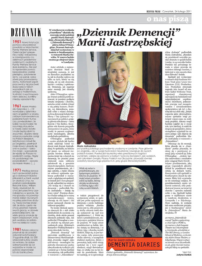 "... this is an uncompromising but sympathetic depiction of how dementia affects not just the sufferers but also their family and carers. Jastrzebska has written monologues for each of the five Anglo-Polish characters – they all speak to the audience but never to each other. It’s a clever device to highlight the way family members can often speak without listening when faced with this kind of situation. Sat on either side of a simple set, Tata and Mama both have dementia; their son Edzio complains endlessly about unsatisfactory phone calls; their desperately stressed, unnamed daughter is always at a desk of paperwork and wine; Mrs Alicja, the sweet but frustrated Polish carer quietly busies herself behind them all at a table.