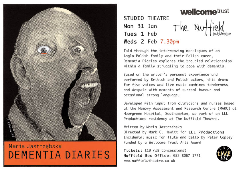 Financially supported by a Wellcome Trust Arts Award. The grant has allowed LLL Productions to meet and talk with research clinicians, nurses, therapists and doctors based at the Memory Assessment and Research Centre (MARC) in Southampton with a view to enhancing the authenticity of the production and collaborating on the content of the production's printed programme. We are thankful to The Nuffield, Southampton, for generously supporting this research and development phase.