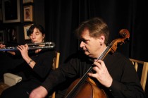 The musical score performed by Peter Copley (composer / cello) and Anne Hodgson (flute) weaves the stories together. Each piece is associated with a particular character in the play and designed to be a portrayal of the inner life of the respective characters. Disturbing but joyful at times the music sets the mood for the play and the characters."