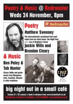 Matthew Sweeney launched his latest book of poetry, The Night Post. Plus readings by Brendan Cleary and Jackie Wills. With music from Ireland and Sweden by Ben Paley (fiddle) and Mandy Murray (concertina).