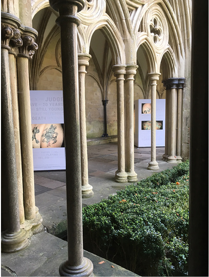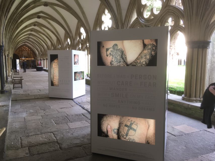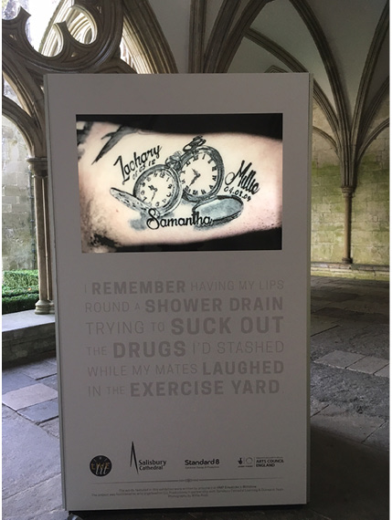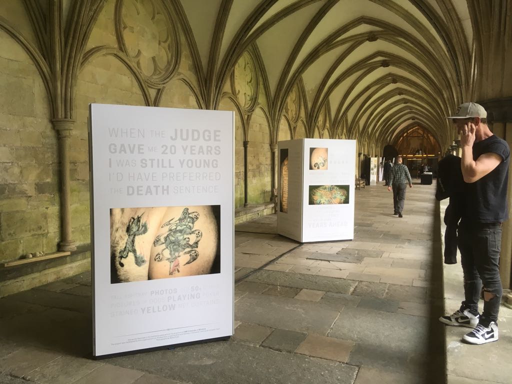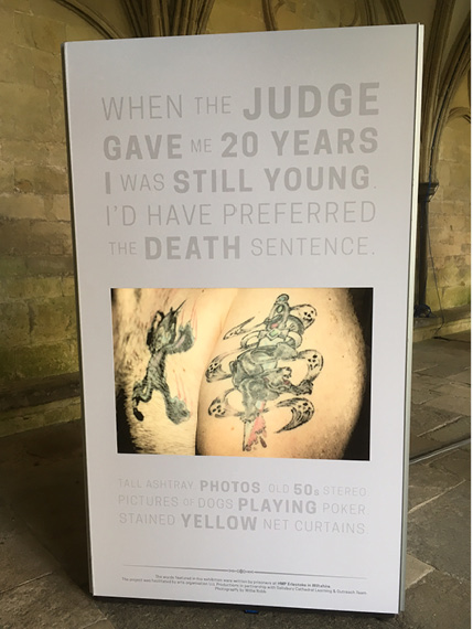 Body of Writing was an installation developed for the cloisters of Salisbury Cathedral which featured the writings of prisoners from HMP Erlestoke in Wiltshire. The project was developed in partnership with Salisbury Cathedral's Learning & Outreach Team as part of a season of events exploring Memory and Identity. The words of the prisoners came out of creative writing workshops linked to LLL's Penned Up festival held at Erlestoke in March 2017. Led by reader development consultant David Kendall and LLL's Artistic Director Mark C. Hewitt, the aim was to focus on creating short, punchy texts that could sit alongside images of prisoners' tattoos by Lewes photographer Willie Robb. The two panelled towers created for the installation were designed and constructed by exhibition company, Standard 8.